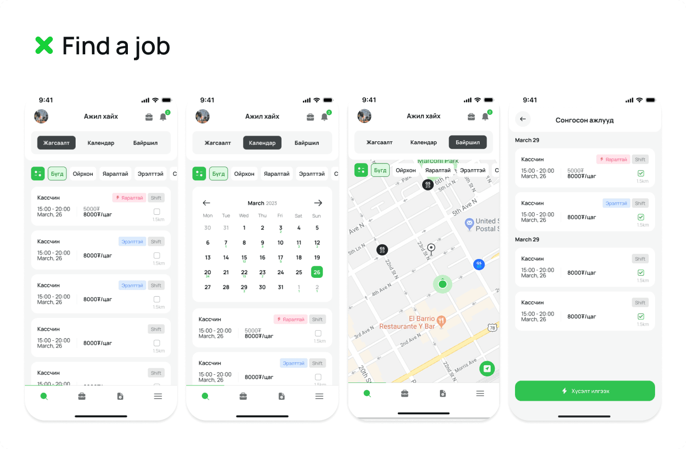 We need to develop a mobile app that helps Mongolian workers find part-time job opportunities in their local area, while also making it easier for employers to connect with qualified candidates.