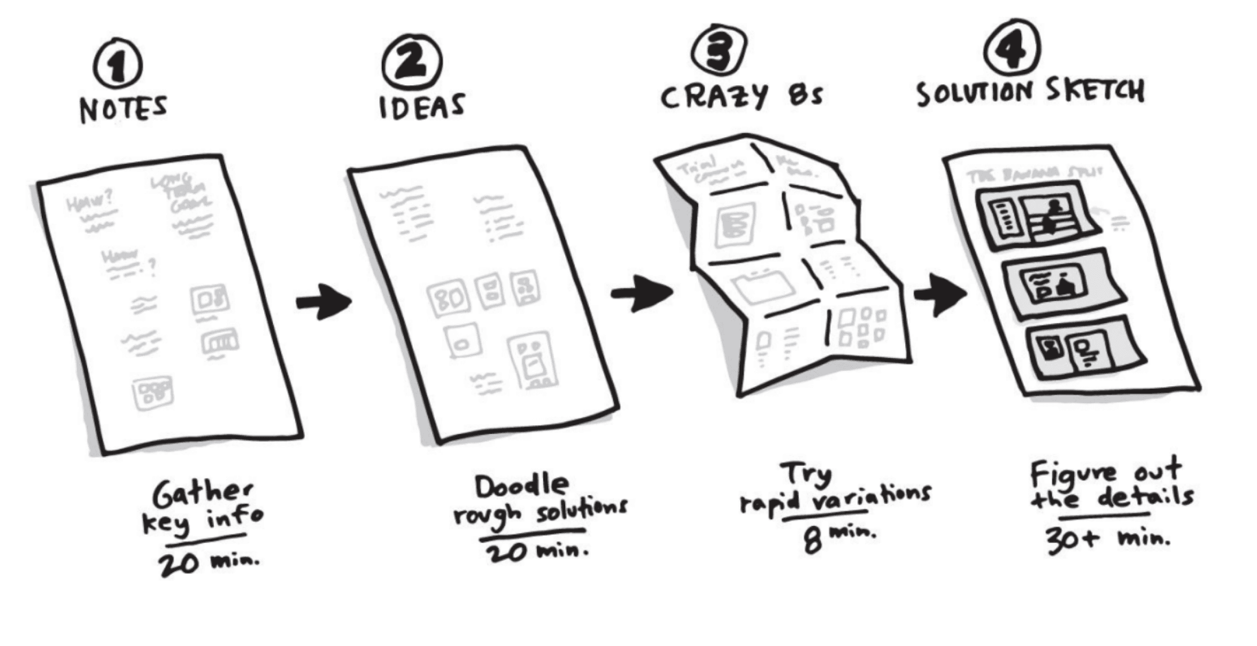 After the lightning demo session, each team member went through the four-step sketch process: taking notes, doodling ideas, doing Crazy 8s, and then committing to a detailed solution sketch.